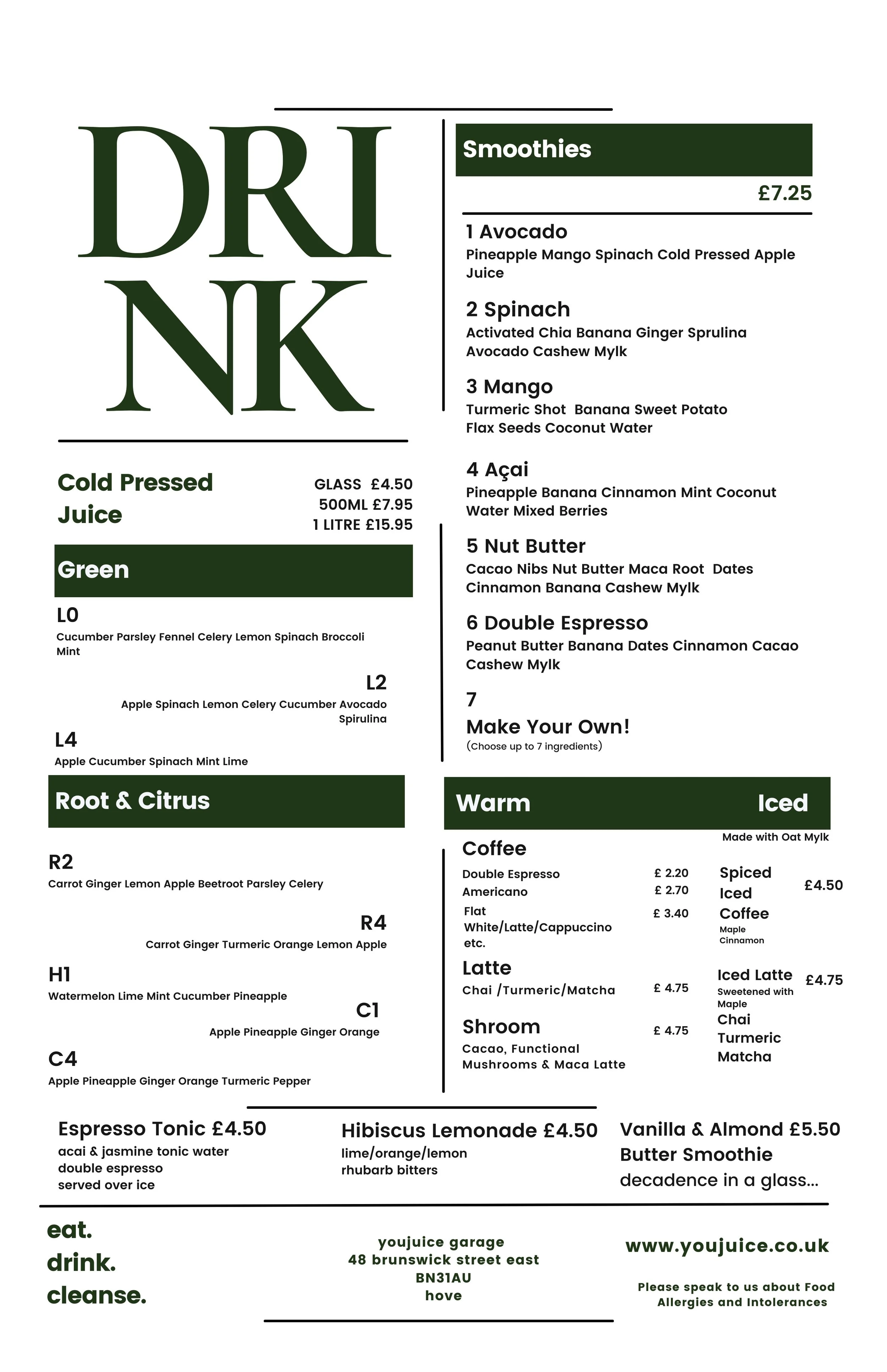 We will feed your body and soul not only with cold pressed juices but immunity shots/ smoothies/ fermented foods/ wholesome soups/ broths/ vegetable stews/ superfood salads/ flax crackers/ kale chips/ dark chocolates and more...